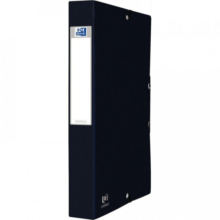 Boite de classement en carte grainée EUROFOLIO+ dos 4 cm, noir. Carte grainée en relief 7/10ème 600g. Format 25 x 33 cm. Étiquette de dos. Fermeture par élastiques. Livrée montée.
