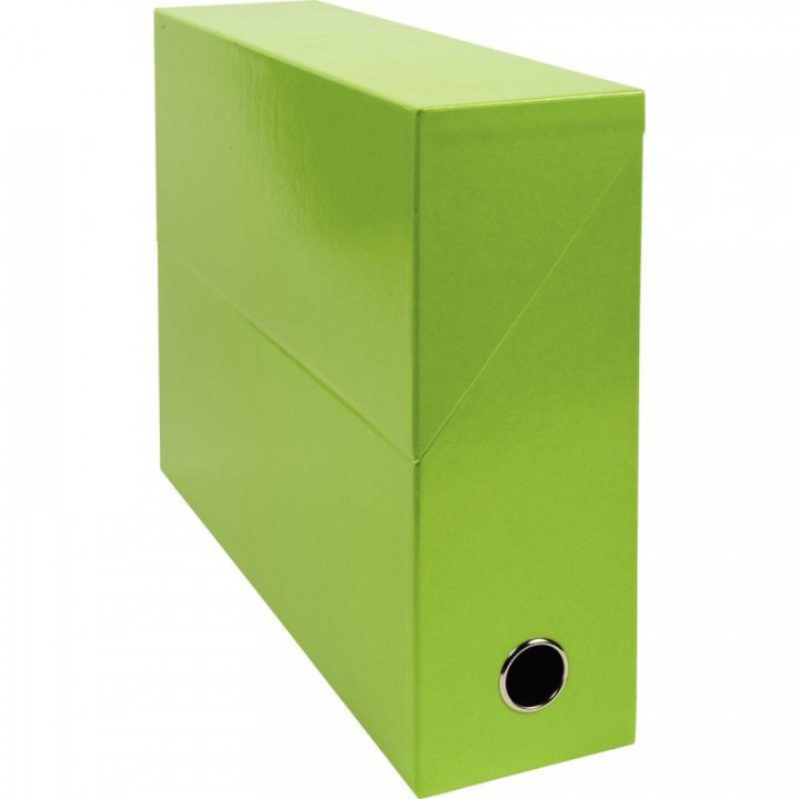 Boite de transfert IDERAMA, dos 9 cm, vert anis. Carton compact rigide recouvert de papier pelliculé. Carte teintée dans la masse, recouverte d'un léger film plastique qui protège. Œillet de préhension chromé. Livrée montée. Couleur lumineuse. Dimensions : L.34 x H.25,5 cm.