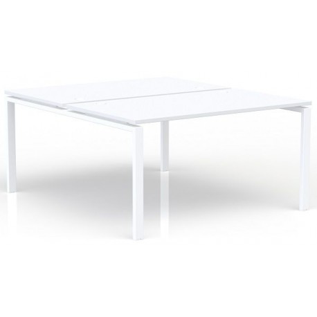 Plans partagés 2 postes. Plateau rectagulaire P.80 cm. Module de départ L.160 x P. 165 cm. Plateaux avec obturateurs optionnels. Bureaux fixes hauteur 73,5 cm. Plateaux mélamine ép. 25 mm, Piétements arche