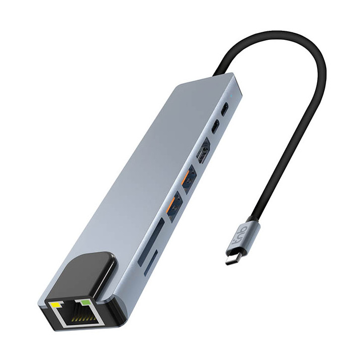 Station d'accueil USB-C 8 ports iClick PRO TNB. Hub 8 en 1 complet. USB 3.2. Entrée USB-C. Plug&Play, sans installation, facile d'utilisation. - 2 x USB-A 3.2 (10 Gbps). - 1x USB-C 3.2 (10 Gbps) - 1x USB-C PD 100W (transfert de charge vers votre notebook) - 1 x HDMI (4K60Hz) - 1 x RJ45 (1 Gbps) - 1 x SD et MicroSD Large panel de connexion pour tous usages. Possibilité de brancher votre réseau filaire grâce au port RJ45 et de connecter votre écran HDMI.