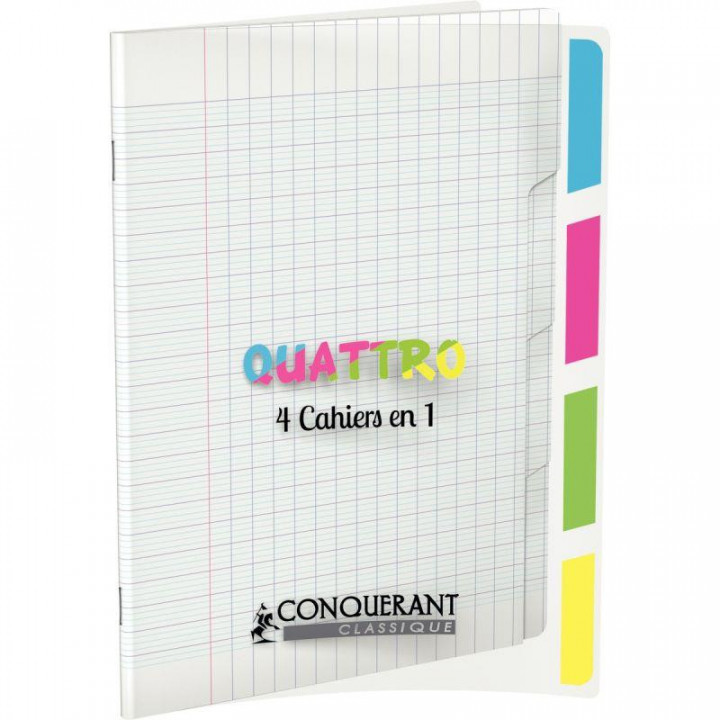 Piqûre 140 pages 4 index CONQUERANT, 17x22 cm, seyès, couv PP incolore. Cahier Quattro 4 en 1. Couverture en polypropylène semi-rigide, papier blanc 90g. 4 parties comme un répertoire. Chacun définit ses propres onglets. Cahier résistant et écologique.