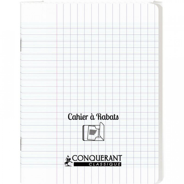 Piqûre 96 pages avec 2 rabats, format 17x22 cm, seyès 90g, couverture polypropylène incolore. Couverture en polypropylène semi-rigide. Papier blanc 90g. Cahier résistant et écologique certifié PEFC.