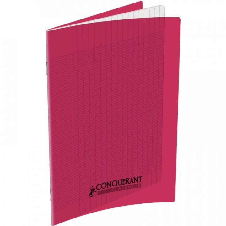 Piqûre 48 pages CONQUERANT, 17x22 cm, seyès, couv PP rose. Papier blanc 90g. Couverture en polypropylène translucide lisse qui rend le cahier souple et robuste.