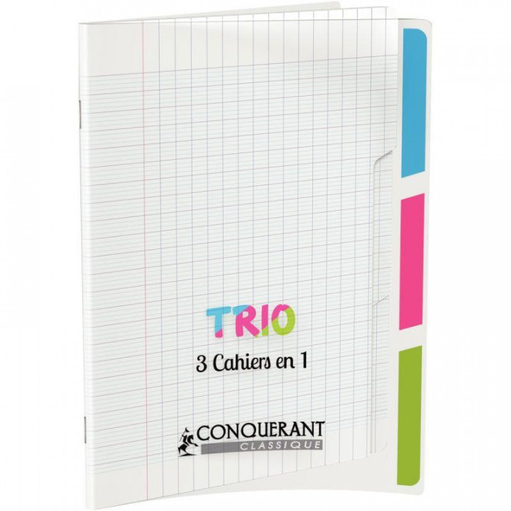 Piqûre 96 pages 3 index CONQUERANT, 17x22 cm, seyès, couv PP incolore. Cahier Trio 3 en 1. Papier 90g. Couverture en polypropylène translucide. Cahier de 96 pages divisé en 3 sections de 32 pages avec onglets découpés de couleurs différentes. 3 usages dans un même cahier, idéal pour alléger les cartables !