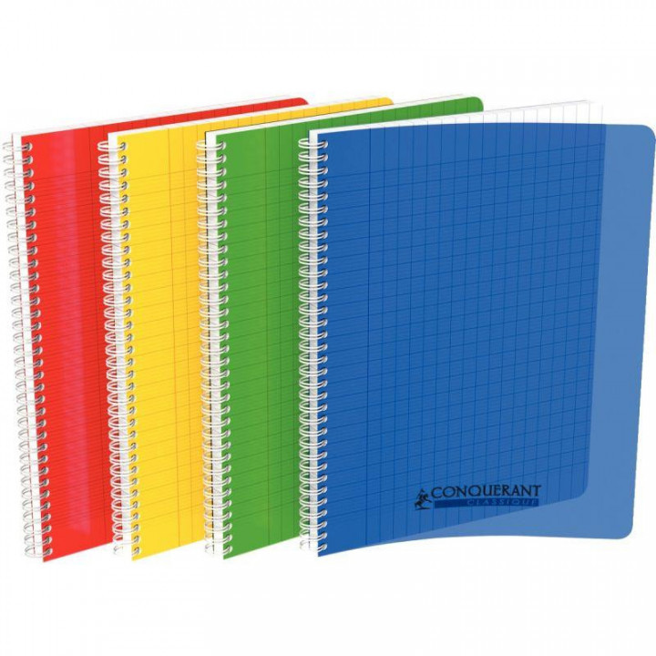 Reliure intégrale 100 pages CONQUERANT, A4, seyès, couverture polypropylène, coloris assortis. Couverture en polypropylène semi-rigide résistant et imperméable. Papier blanc 90g. Reliure intégrale qui permet l'ouverture du cahier à 360°. 4 coloris assortis.