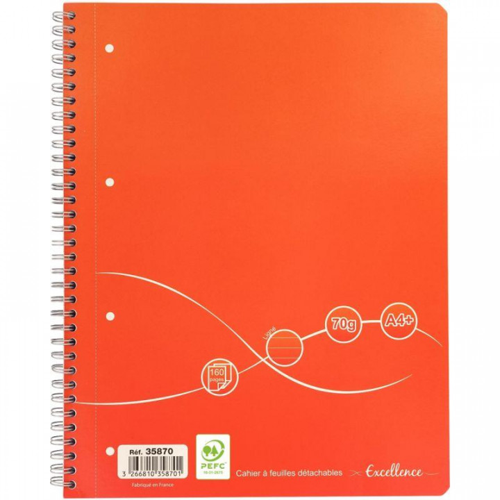 Cahier à reliure intégrale 160 pages EXCELLENCE, format A4+, ligné, papier 70g. Feuilles perforées 4 trous pour un classement rapide. Feuilles micro-perforées détachables au format 21 x 29,7 cm (A4). Couverture carte recyclée 300g, semelle grise 550g.