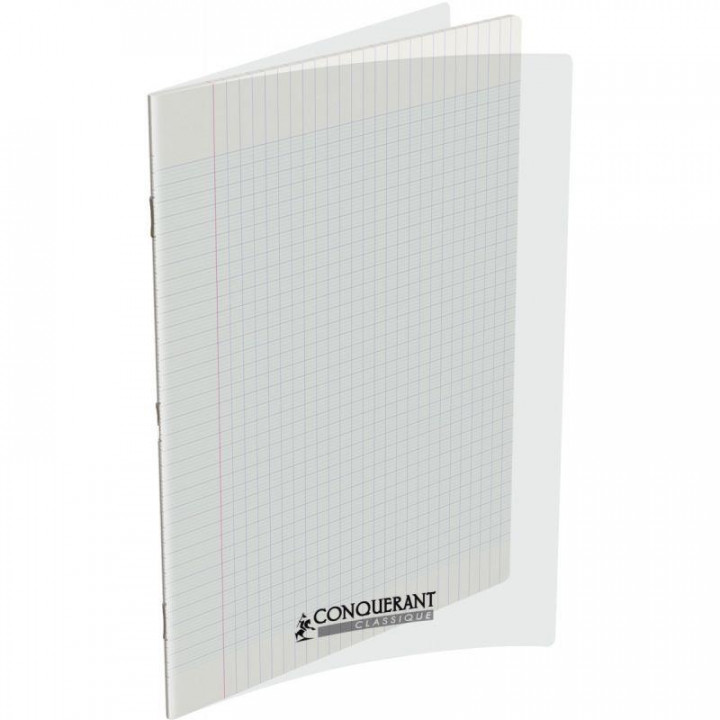Piqûre 140 pages CONQUERANT, 24x32 cm, seyès, couv PP incolore. Papier blanc 90g. Couverture en polypropylène translucide lisse qui rend le cahier souple et robuste.