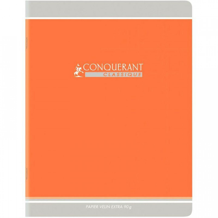Cahier piqué 96 pages, 24x32 cm, seyès, papier 90g, orange. Couverture en carte recyclée 300g avec vernis UV, papier vélin extra 90g.