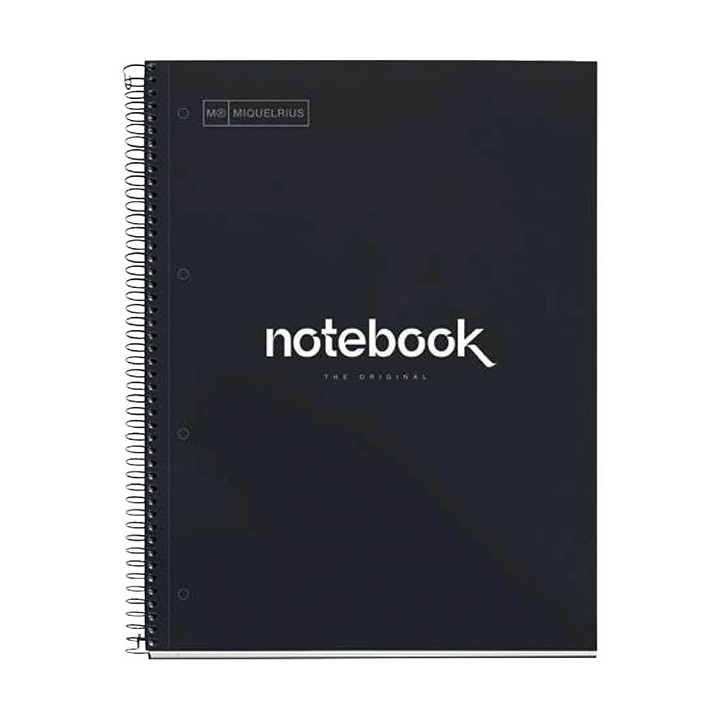 NOTEBOOK MIQUELRIUS format A4, 80 feuilles 90g, quadrillé 5x5, couverture carton rigide noir. Cahier à reliure intégrale NOTEBOOK 1 collection EMOTIONS. Couverture en carton rigide plastifié brillant. Papier blanc extra opaque 90g. 160 pages microperforées détachables et perforées 4 trous. Réglure, en-tête et bords de la même couleur que la couverture.