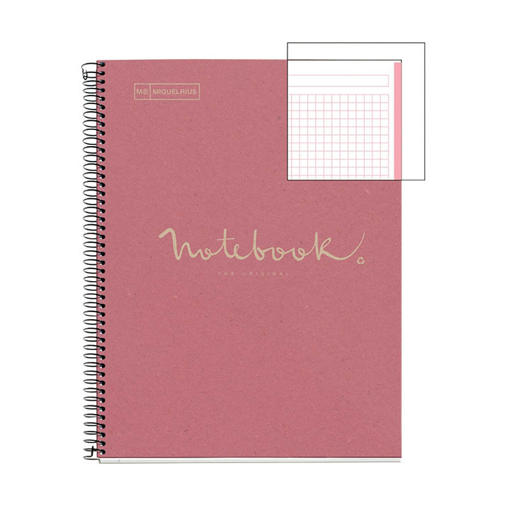 NOTEBOOK MIQUELRIUS format A4, 80 feuilles 80g, quadrillé 5x5, couverture carton recyclé rose. Cahier à reliure intégrale NOTEBOOK 1 collection ECO. Couverture en carton imprimé 100% recyclé. Papier blanc 100% recyclé 80g. 160 pages microperforées détachables et perforées 4 trous. Réglure, en-tête et bords de la même couleur que la couverture.
