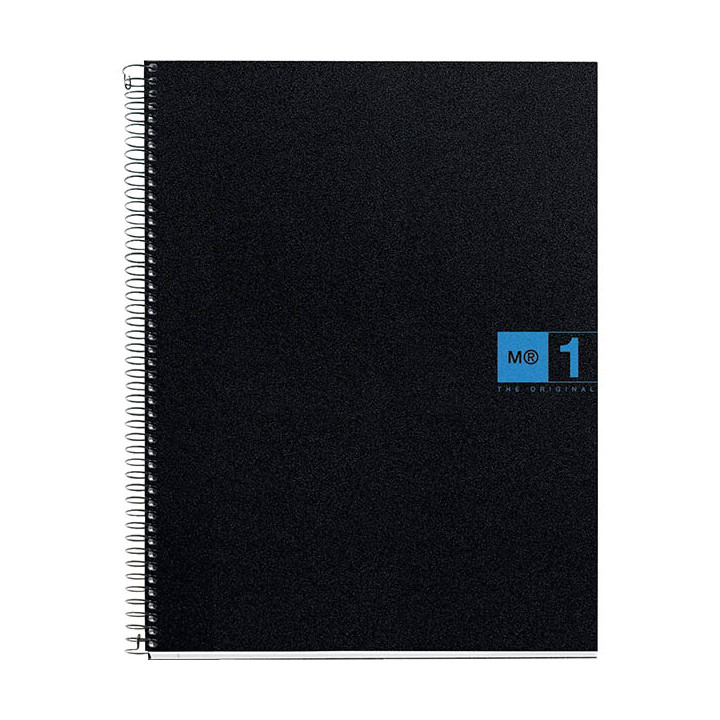 NOTEBOOK MIQUELRIUS format A4, 80 feuilles 70g, quadrillé 5x5, couverture PP noir, intérieur bleu. Cahier à reliure intégrale NOTEBOOK 1 collection THE ORIGINAL. Couverture en polypropylène opaque noir 8/10ème, souple et résistant à l'usure. Papier blanc extra opaque 70g. 160 pages microperforées détachables et perforées 4 trous. Réglure, en-tête et bords coloris bleu.