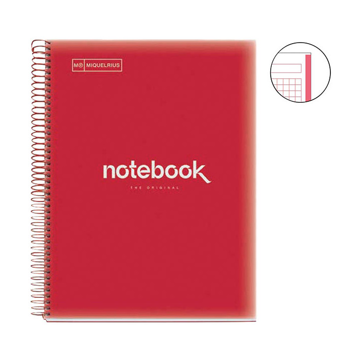 NOTEBOOK MIQUELRIUS format A4, 80 feuilles 90g, quadrillé 5x5, couverture PP rouge. Cahier à reliure intégrale NOTEBOOK 1 collection EMOTIONS. Couverture en polypropylène translucide 8/10ème, souple et résistant à l'usure. Papier blanc extra opaque 90g. 160 pages microperforées détachables et perforées 4 trous. Réglure, en-tête et bords de la même couleur que la couverture.