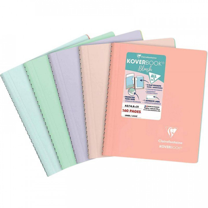Cahier à reliure intégrale 160 pages KOVERBOOK BLUSH, format A5, ligné. Cahier tendance aux tonalités pastel ! Couverture bicolore enveloppante en polypropylène opaque, épais et résistant avec 2 rabats. 2 en 1 : les rabats peuvent à la fois servir de marque-pages et de pochettes pour ranger les documents. 5 coloris pastel assortis : bleu givré, menthe à l'eau, lilas, rose poudré et corail. Avec une étiquette adhésive pour personnaliser le cahier. Papier vélin velouté 90g, pour une sensation de glisse unique.