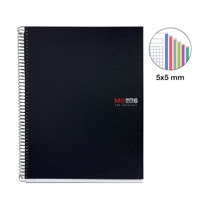 NOTEBOOK MIQUELRIUS format A5, 150 feuilles 70g, quadrillé 5x5, couverture PP noir. Cahier à reliure intégrale NOTEBOOK 6 collection THE ORIGINAL. Couverture en polypropylène opaque noir 8/10ème, souple et résistant à l'usure. Papier blanc extra opaque 70g. 300 pages microperforées détachables et perforées. Réglure, en-tête et bords de 6 couleurs assorties.