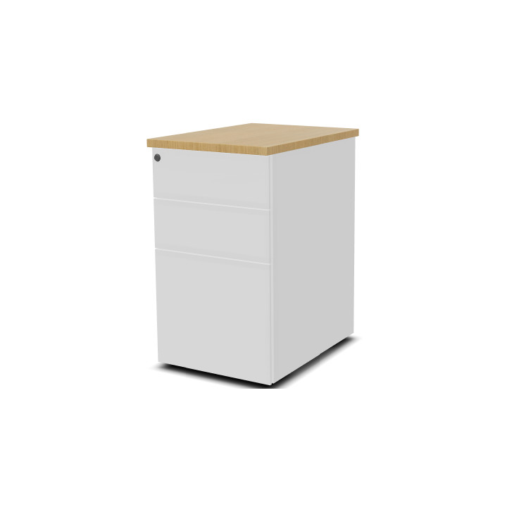 Caissons P. 60 cm avec top mélamine - L. 43,2 x H. 73,5 cm. Utiles en configuration caisson juxtaposé. 3 tiroirs dont 1 pour DS. Top métallique structurel ou top mélamine, 6 décors assortis aux plateaux des bureaux daménagement. Caissons métalliques, façades à préhension latérale, Tiroirs avec glissières à billes, extraction 100% pour les tiroirs à dossiers suspendus. Roulettes non apparentes sur les caissons mobiles. Plumier intégré dans le premier tiroir plat du caisson. Ouverture sélective des tiroirs, serrure à barillet interchangeable