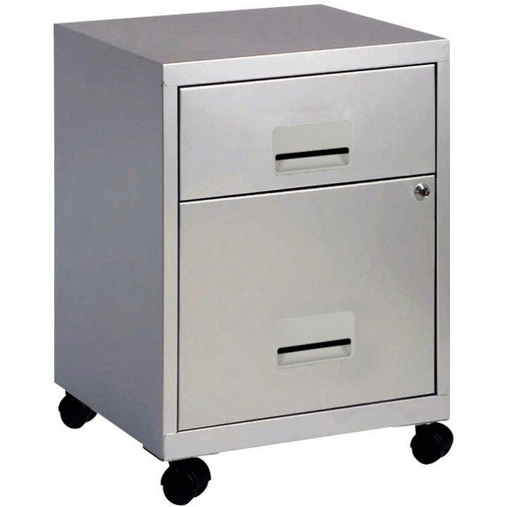 Caisson mobile économique en métal 2 tiroirs Aluminium. H57 cm x P40 cm x L40 cm 1 tiroir plat et 1 tiroir pour dossiers suspendus. Garantie 2 ans.