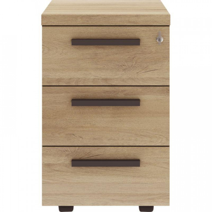 Caisson mobile 3 tiroirs Brabant L42xH65xP60cm chêne du bocage/anthracite. Aussi à l’aise en configuration manager comme qu’en aménagement d’espace, le bureau droit comme le bureau avec retour direct permettent de créer des espaces multipostes efficaces. Corps et façades : panneaux de particules revêtus mélamine imitation chêne naturel structuré veinée et mélamine blanche sablée ou chêne du bocage veiné et mélamine anthracite sablée. Chants même finition dont certains ABS 1 ou 2mm. Verrouillage centralisé des 3 tiroirs. Garantie 5 ans.
