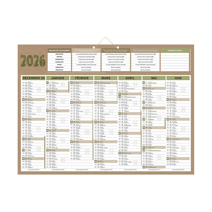 Calendrier semestriel 7 mois par face Natura 40,5x55cm. Format : 40,5 x 55 cm. 7 mois sur chaque face. 2 œillets et un cordonnet de suspension. Congés scolaires et numérotation des semaines. Lunaisons. Imprimé et contrecollé sur papier et carton recyclés.