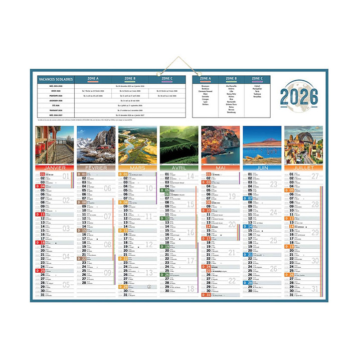 Calendrier semestriel 7 mois par face Planète 43x55cm. Format : 43 x 55 cm. 7 mois sur chaque face. 2 œillets en métal et un cordonnet de suspension. Illustrations photos paysages du monde. Lunaisons. Congés scolaires ainsi que de la numérotation des semaines.