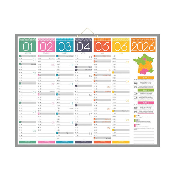 Calendrier semestriel 6 mois par face Tendance 43x55cm. Format : 43 x 55 cm. 6 mois sur chaque face. 2 œillets en métal et 1 cordonnet de suspension. Congés scolaires. Jours ouvrés et jours ouvrables. Grille épurée. Numérotation des semaines.
