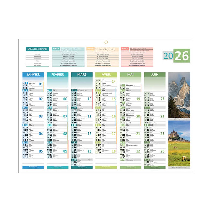 Calendrier semestriel 6 mois par face 4 saisons 32x42cm. Format : 42 x 32 cm. 6 mois sur chaque face. 1 œillet en métal. Congés scolaires et numérotations des semaines. Lunaisons.