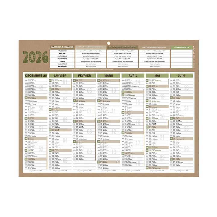 Calendrier Natura médium 32x42cm. Format : 32 x 42 cm. 7 mois sur chaque face. Congés scolaires et numérotation des semaines. Lunaisons. Imprimé et contrecollé sur papier et carton recyclés.