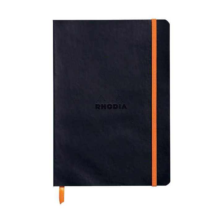 Carnet 160 pages RHODIARAMA format A5, 5x5, couverture souple en simili cuir, noir. Dos carré collé. Ruban marque-page et pochette à soufflet à l'intérieur. Papier vélin velouté 90g ivoire. Fermeture par élastique. Format A5 = 14,8 x 21 cm.