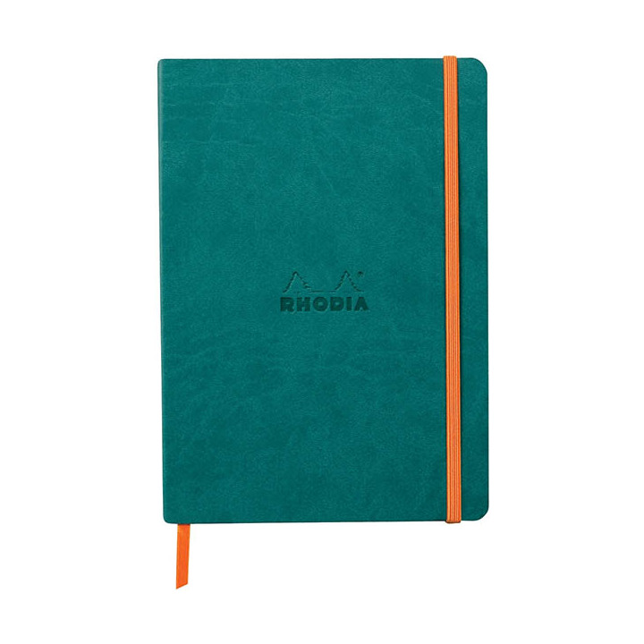 Carnet 160 pages RHODIARAMA format A5, ligné, couverture souple en simili cuir, bleu paon. Dos carré collé. Ruban marque-page et pochette à soufflet à l'intérieur. Papier vélin velouté 90g ivoire. Fermeture par élastique. Format A5 = 14,8 x 21 cm.
