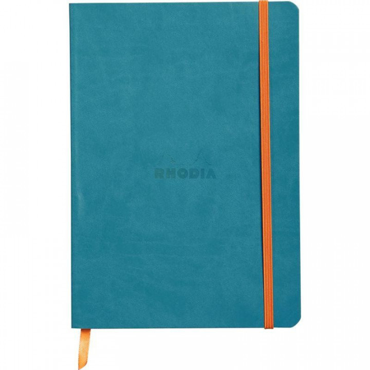 Carnet 160 pages RHODIARAMA format A5, ligné, couverture souple en simili cuir, bleu turquoise. Dos carré collé. Ruban marque-page et pochette à soufflet à l'intérieur. Papier vélin velouté 90g ivoire. Fermeture par élastique. Format A5 = 14,8 x 21 cm.