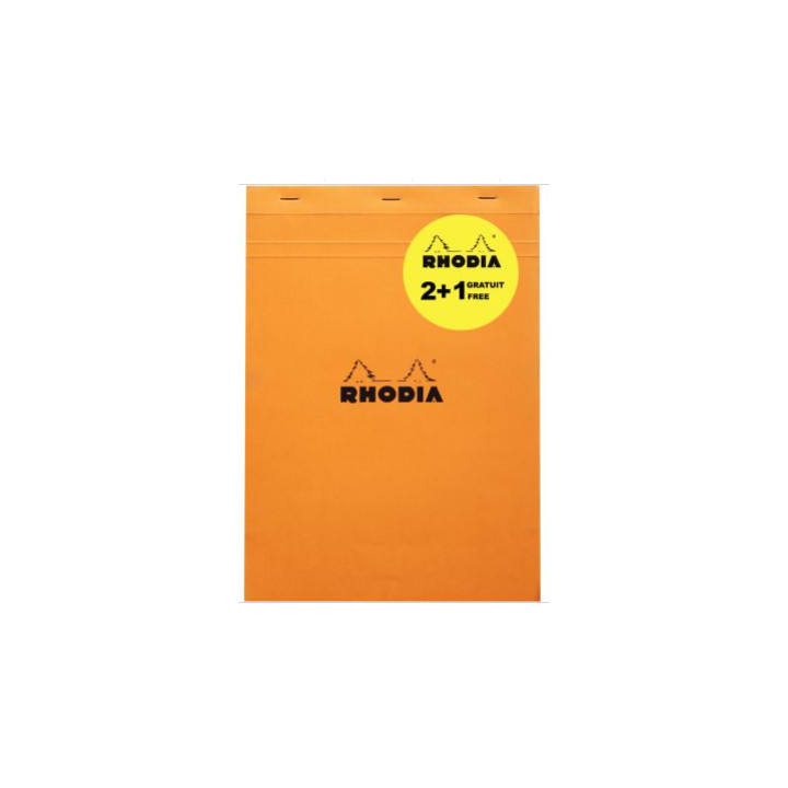 Lot de 2 blocs de bureau RHODIA 80 feuilles, format A4, quadrillé 5x5, papier blanc 80g + 1 gratuit. Format A4 = 21 x 29,7 cm. 80 feuilles = 160 pages d'écriture. Papier blanc vélin surfin 80g pour un grand confort d'écriture. Couverture en carte orange enveloppante enduite et rabattable ultra résistante. Feuilles micro-perforées détachables mais NON perforées. Dessous cartonné facilitant la prise de notes.