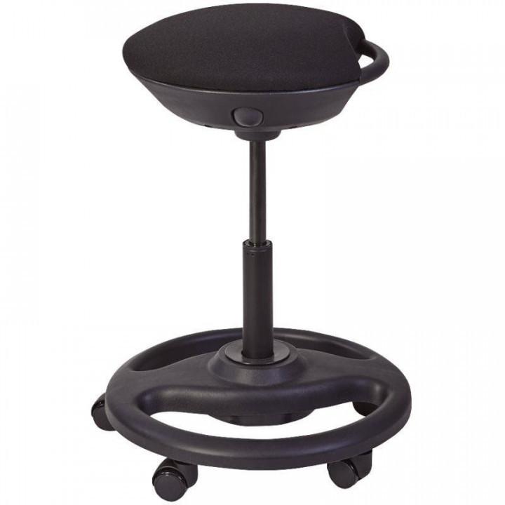 Tabouret assis debout mobile Rolly noir. Mousse rembourrée pour un confort optimal d'assise. Ø assise 43cm. Axe avec effet de balancier et une assise dynamique. 5 roulettes + poignée pour le déplacer. Vérin à gaz pour ajuster la hauteur (57,5 à 73,5cm) grâce aux 2 poignées sous l'assise. Roues autobloquantes une fois l'utilisateur assis. Pour utilisateur jusqu'à 120kgs. Garantie 5 ans.