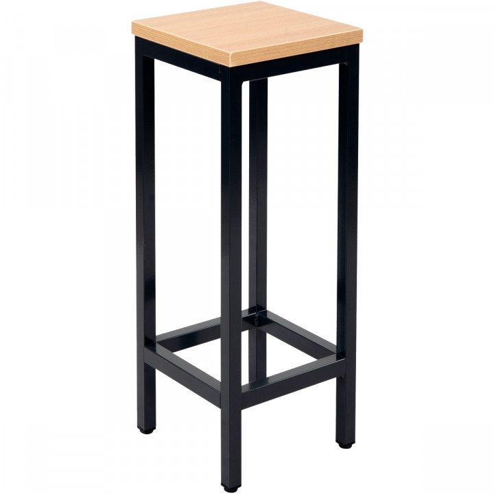 Tabouret H74cm plateau hêtre/piètement noir. Structure en acier 30x30mm avec époxy noir sur vérin réglable. Assise épaisseur 25mm (33cm x 33cm). Garantie 5 ans.