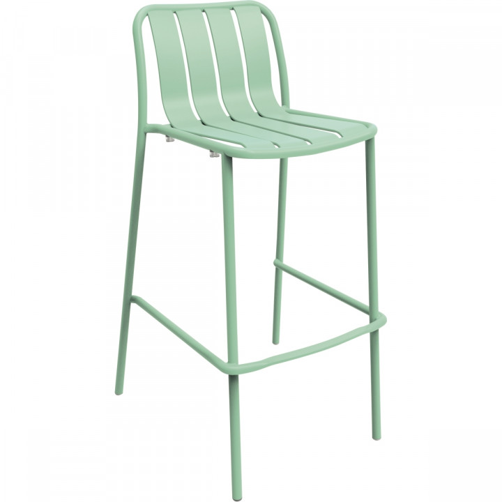 Tabouret haut avec dossier Verano vert menthe. Mobilier extérieur entièrement 100% aluminium, durable et élégant, léger et résistant. Longévité exceptionnelle. Entretien facile. Label BSCI, conforme à la normes EN581-2. Pour utilisateur jusqu’à 95kg. Garantie 3 ans.
