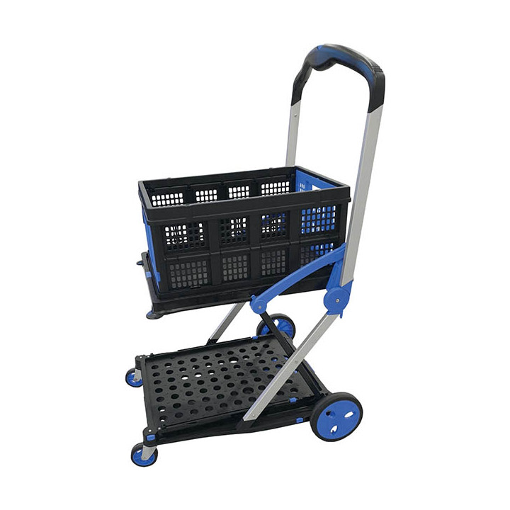 Chariot pliable porte bacs en aluminium. Chariot entièrement pliable avec deux plateaux. Structure en aluminium. Capacité de charge jusqu'à 70kg. Usage polyvalent. Livré avec un bac de rangement. Charge max tablette basse : 50kg Charge max tablette haute : 20kg Possibilité de rajouter un renfort pour la tablette haute : charge maxi 40kg.
