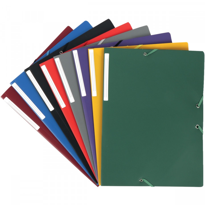 Carton de 50 chemises 3 rabats à élastiques en polypropylène opaque 4/10ème, coloris assortis. 8 couleurs assorties : bleu, noir, gris, bordeaux, vert, rouge, violet, jaune. Étiquette de dos. Dos 2,8 cm. Capacité 250 feuilles.