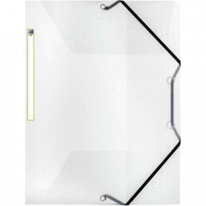 Chemise 3 rabats à élastiques 2ND LIFE en polypropylène, incolore. Couverture en polypropylène translucide 5/10ème 100% recyclé, issu des chutes collectées en milieu industriel. Format 24 x 32 cm pour documents A4. Grain effet givré. Étiquette de dos. Capacité 150 feuilles. Dos plat. Fermeture par élastiques.