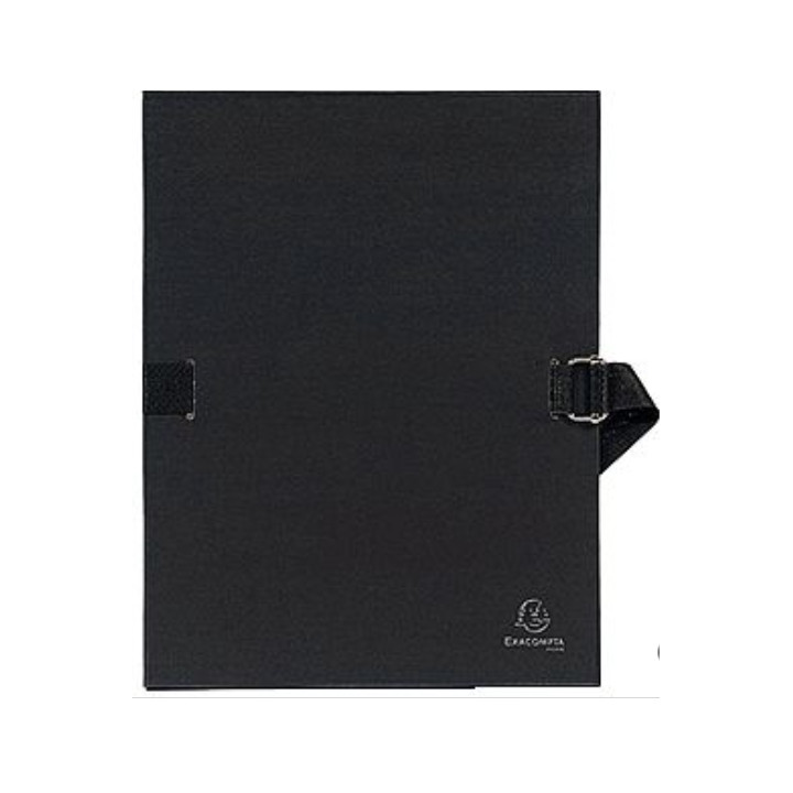 Chemise extensible toilée, noir. Sans rabat. Plats et dos en carton recouvert de papier toilé. Fermeture par sangle et boucle métal à coulisseau cranté. Format 24x32 cm pour documents A4. Dos extensible jusqu'à 13 cm. Capacité 1000 feuilles.
