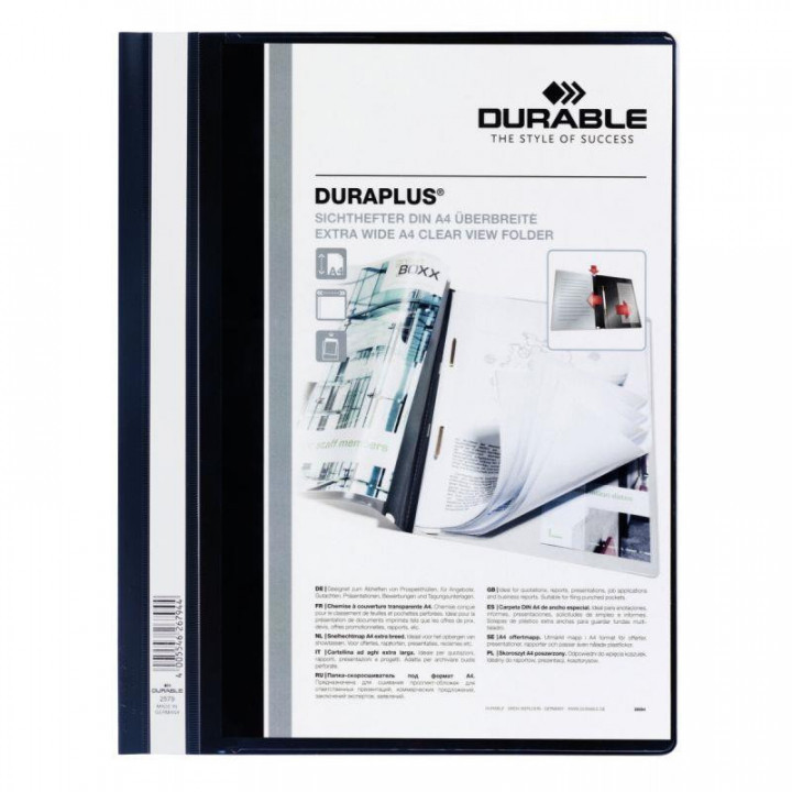 Chemise DURAPLUS personnalisable transparent/noir. Chemise de présentation extra large. Mécanisme à lamelles en laiton permettant l'insertion de pochettes et documents perforés.Couverture personnalisable et porte-étiquette sur toute la hauteur de la chemise.Pochette intérieure transparente.Pour devis, offres commerciales, rapports etc....