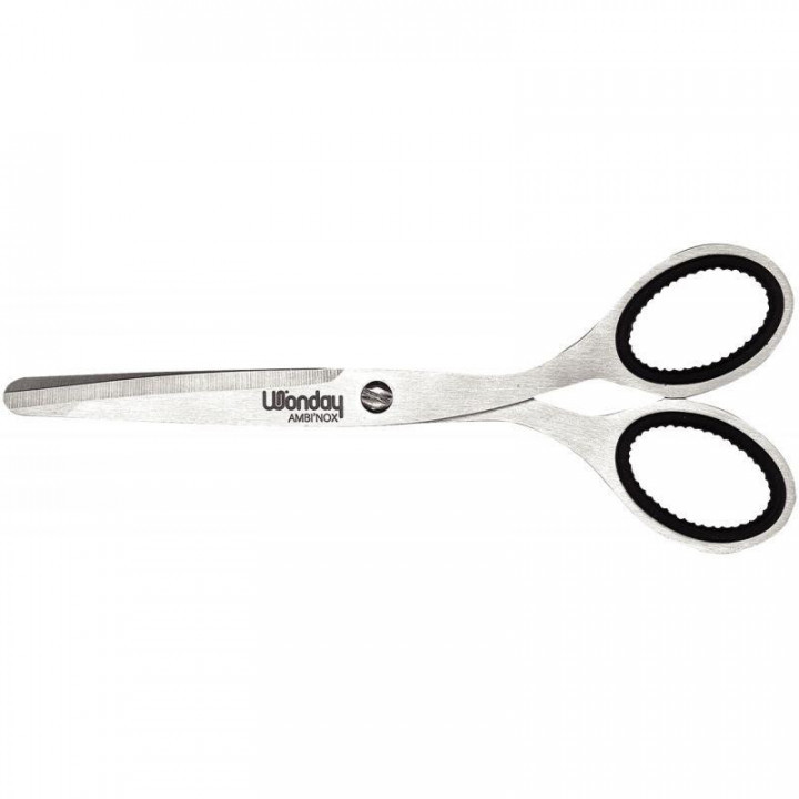 Ciseaux en acier inoxydable bouts ronds 17cm. Acier inox trempé finition satiné. Anneaux renforcés par un grip caoutchouc. Haute qualité Garantie 2 ans