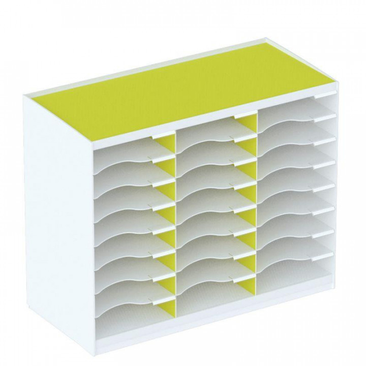 Trieur à courrier 24 cases blanc/vert. Trieurs 24 cases STRUCTURE : polystyrène. CASES : polystyrène. Capacité : document format A4. Dim utiles : H. 5.8 x L. 22 x P. 29.7 cm LES + PRODUITS : - Se superposent facilement par emboîtement. - Système d’indexation. LOGISTIQUE : livré monté, porte étiquettes et étiquettes fournis.
