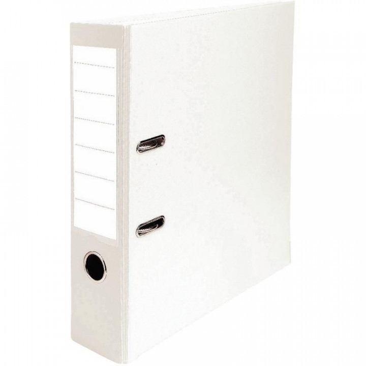 Classeur à levier économique pour format A4, dos 5 cm, blanc. Dimensions 28,5 x 32 cm pour format A4 (21 x 29,7 cm). Carton recouvert de polypropylène, intérieur papier blanc. Grand porte-étiquette soudé + étiquette. Œillet de préhension et griffes de blocage. Coins et renforts métalliques.