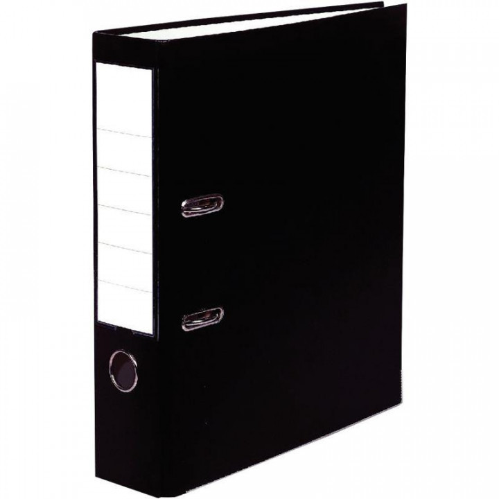 Classeur à levier économique pour format A4, dos 5 cm, noir. Dimensions 28,5 x 32 cm pour format A4 (21 x 29,7 cm). Carton recouvert de polypropylène, intérieur papier blanc. Grand porte-étiquette soudé + étiquette. Œillet de préhension et griffes de blocage. Coins et renforts métalliques.