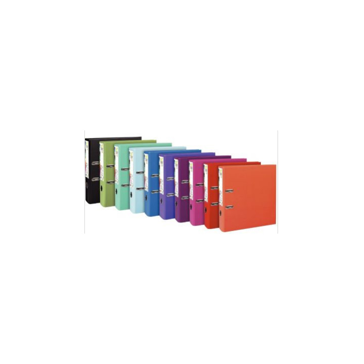 Classeur à levier PREM'TOUCH format A4+, dos 8 cm, couleurs pastel assorties. Carton épais recouvert de polypropylène 28/10ème intérieur et extérieur. Format A4+ (32 x 30 cm) pour documents A4 à classer (21 x 29,7 cm), idéal pour utiliser des intercalaires pour pochettes perforées sans jamais dépasser. Porte-étiquette soudé + étiquette. Mécanisme Prem'Touch en acier renforcé garanti 10 ans et ergonomique grâce à son bouton poussoir. Coins métalliques et renforts. Œillet de préhension.