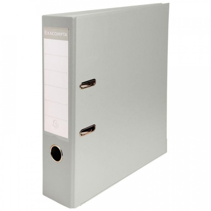 Classeur à levier pour format A4, dos 8 cm, gris. Classeur en carton épais recouvert de polypropylène (plat et dos), intérieur papier. OEillet de préhension et renforts métalliques à la base du classeur pour éviter une usure prématurée en position verticale. Grand porte-étiquette et étiquette utilisable recto/verso. Format extérieur 32 x 29 cm.