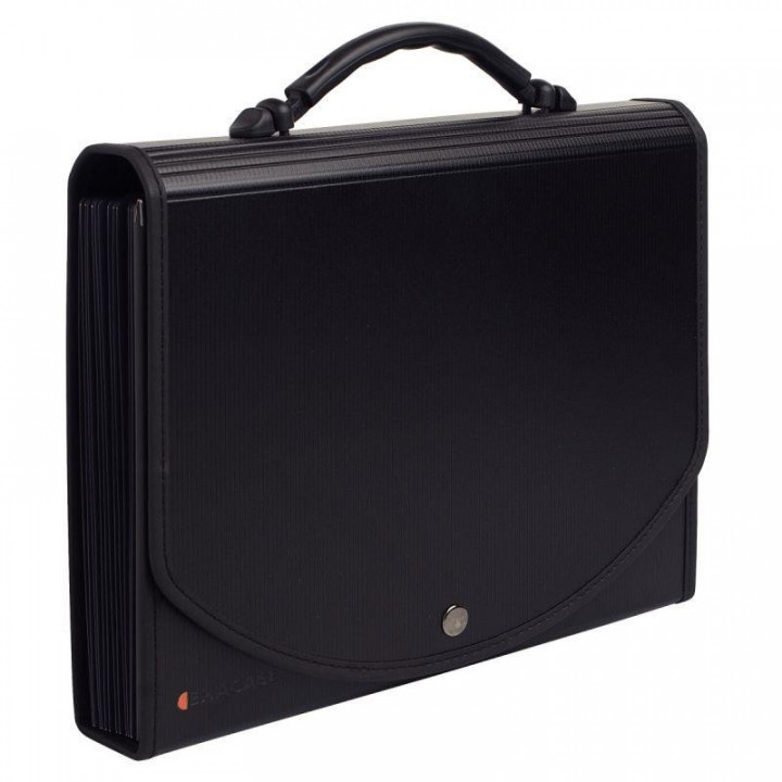 Valisette trieur EXACASE en polypropylène, 13 compartiments, noir. Dimensions 33 x 26 x dos 5 cm pour format A4 à classer. 13 compartiments en polypropylène gris fumé 13/100ème avec onglets personnalisables, étiquettes fournies. Poignée de transport ergonomique et rétractable. Écologique car 98% recyclable, léger et résistant. Couverture en polypropylène noir 23/10ème. Capacité 400 feuilles. Fermeture par bouton pression.