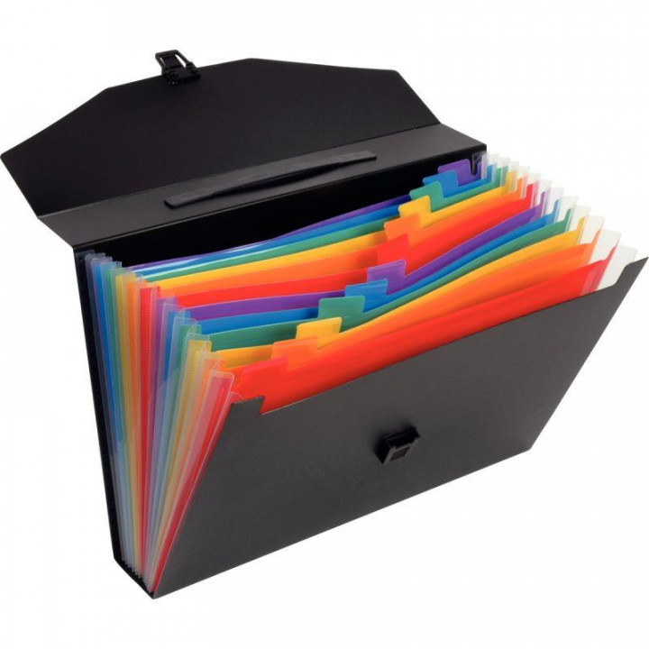 Valisette trieur RAINBOW CLASS en polypropylène, 12 compartiments. Polypropylène 10/10ème, couverture noire, intérieur trieur à soufflet multicolore. Fermeture rabat et tuck en plastique. Poignée de transport rétractable. Étiquettes d'identification fournies. Dimensions : L.38 x l.26 x ép.6 cm. Pour format A4 à classer.