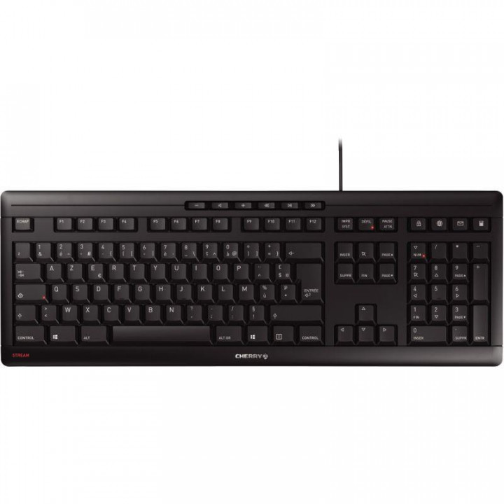 Clavier filaire Cherry Stream couleur noir. Clavier CHERRY STREAM KEYBOARD multimédia azerty filaire. -Plat et silencieux. -Touches résistant à l'usure. -Résistant aux projections d'eau. -10 touches de raccourcis bureautiques et multimédia (verrouillage de la session, internet, mail, calculatrice + touches multimédia). -Leds d'état intégrées dans les touches Maj, Num et défi. -Connexion USB.