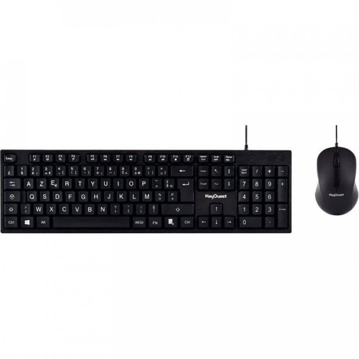 Pack clavier et souris filaire KeyOuest. Clavier azerty : touches souples et silencieuses avec pavé numérique. Hauteur réglable. Interface USB. Longueur de câble 1,2 mètre. Souris : résolution 1 000 dpi. 3 boutons. Longueur de câble 1,2 mètre. Garantie 2 ans.