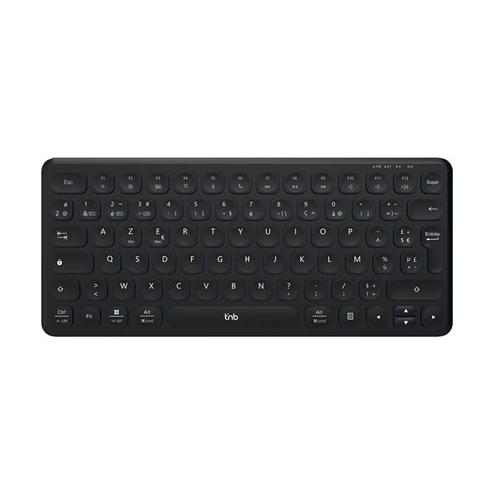 Clavier compact sans fil rechargeable TNB noir. Conçu avec 85% de plastique recyclé. Clavier Bluetooth rechargeable ultra fin. Forme compacte, recommandée par les ergonomes car elle minimise le déplacement des mains, touches confortables ultra fines et silencieuses. Raccourcis multimédias et touches multifonctions compatibles Windows et macOS Double connectivité Bluetooth 5.0 + USB-A 2,4 GHz. Câble de charge USB-C inclus. Batterie intégrée 300mAh. Dimensions : 29.5x12.5x2.2 cm. Couleur noir