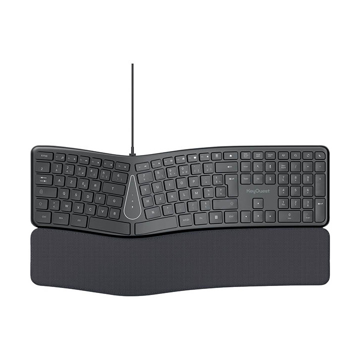 Clavier filaire ekogreen ergonomique gris. Conçu avec 85% de plastique recyclé. certifié, réduit la fatigue musculaire. Clavier incurvé avec inclinaison et hauteur réglables et repose poignets en tissu pour un confort accru. Touches slim et silencieuses. Résistant aux éclaboussures Câble USB-A longueur 1.5m Garantie constructeur 10 ans.